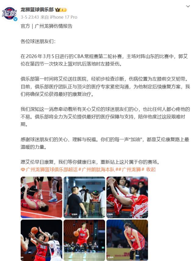 检查结果显示,郭艾伦遭遇左膝前交叉韧带撕裂。