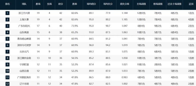 本赛季至今,广东队17胜6负联盟第三,广厦队和上海队分列前二,山东队第四,青岛队第五,深圳队第六,北京队第七,浙江队第八,宁波队第九,山西队第十,广州队第11,辽宁队第12。